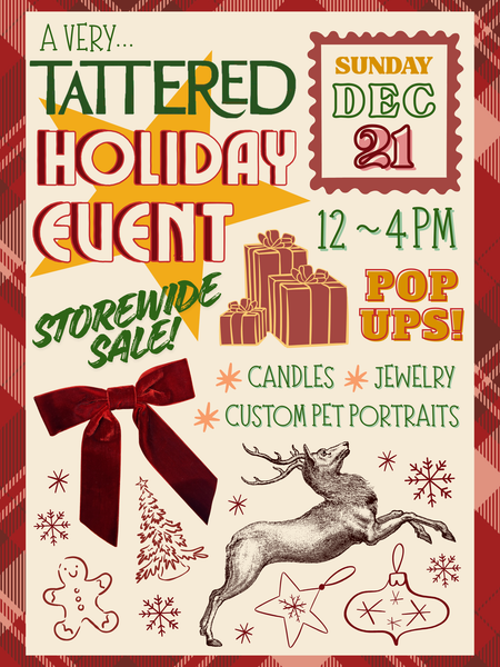 Tis the season for gift giving~❤️💚 Join Tattered for our Holiday Event on December 21st, Sunday from 12-4pm 🎄 There will be local Long Beach businesses selling the perfect gifts for your loved ones! 🎁 Bespoke candles by @leatherandlinoleum makes for the best stocking stuffers! 🕯️Check out @maridajewelry for that classy lady in your life! If you have pets, bring a picture of them to get their portrait done by artist @lainyluck! 🐶🎨🐱 We will also be having a storewide sale to go along with all the festivities 🎅🦌